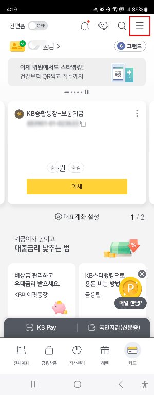 1. 국민은행 앱의 상단 우측 줄 3개 메뉴를 클릭합니다.
