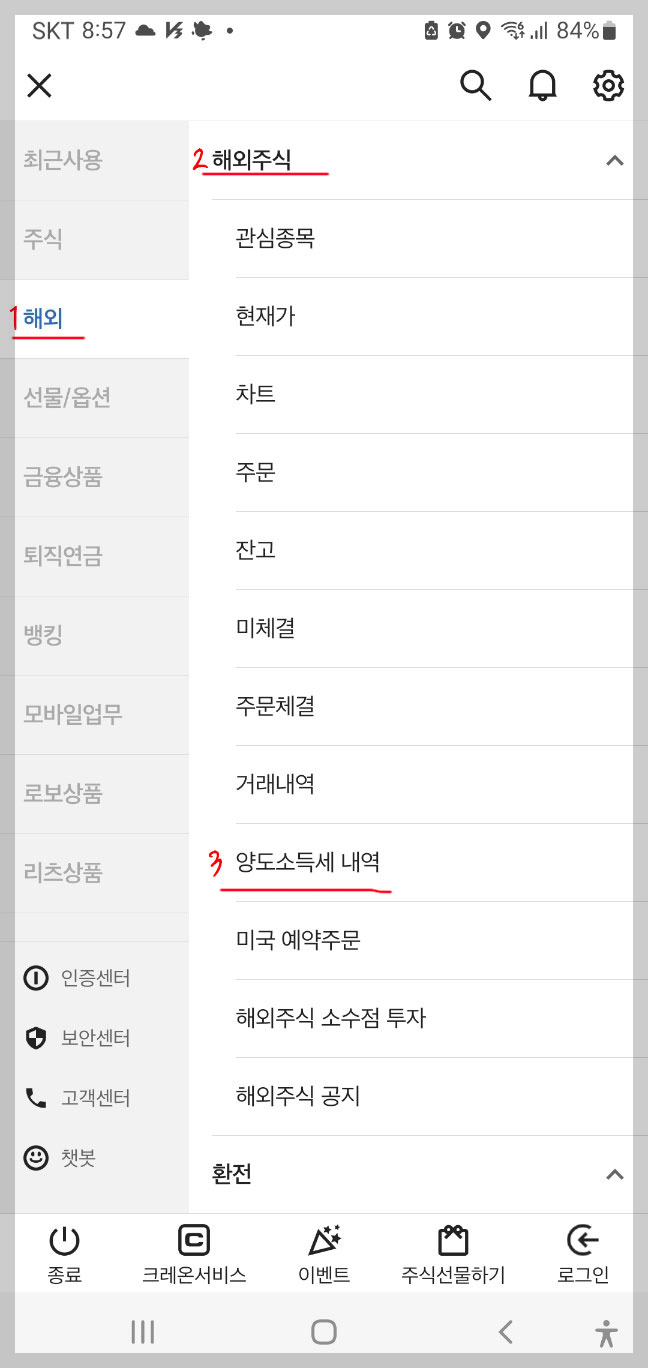 1) 위 오른쪽 화면 번호 순서대로 메뉴를 찾아 최종 해외주식세금을 클릭합니다.